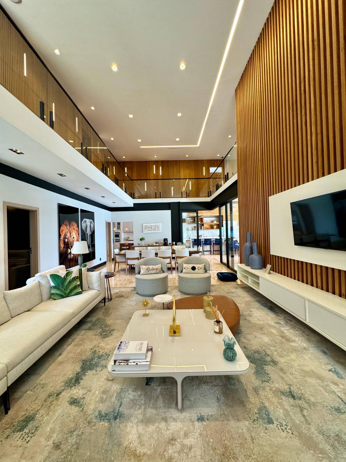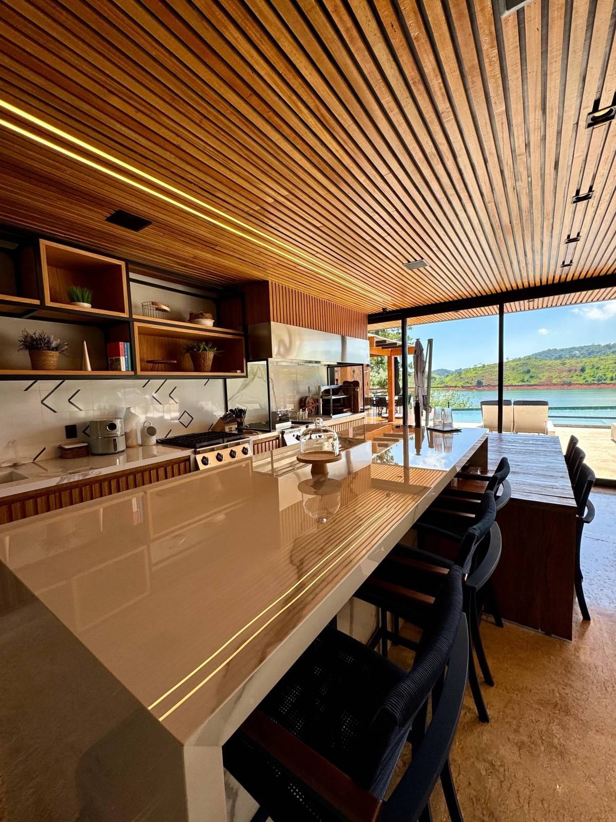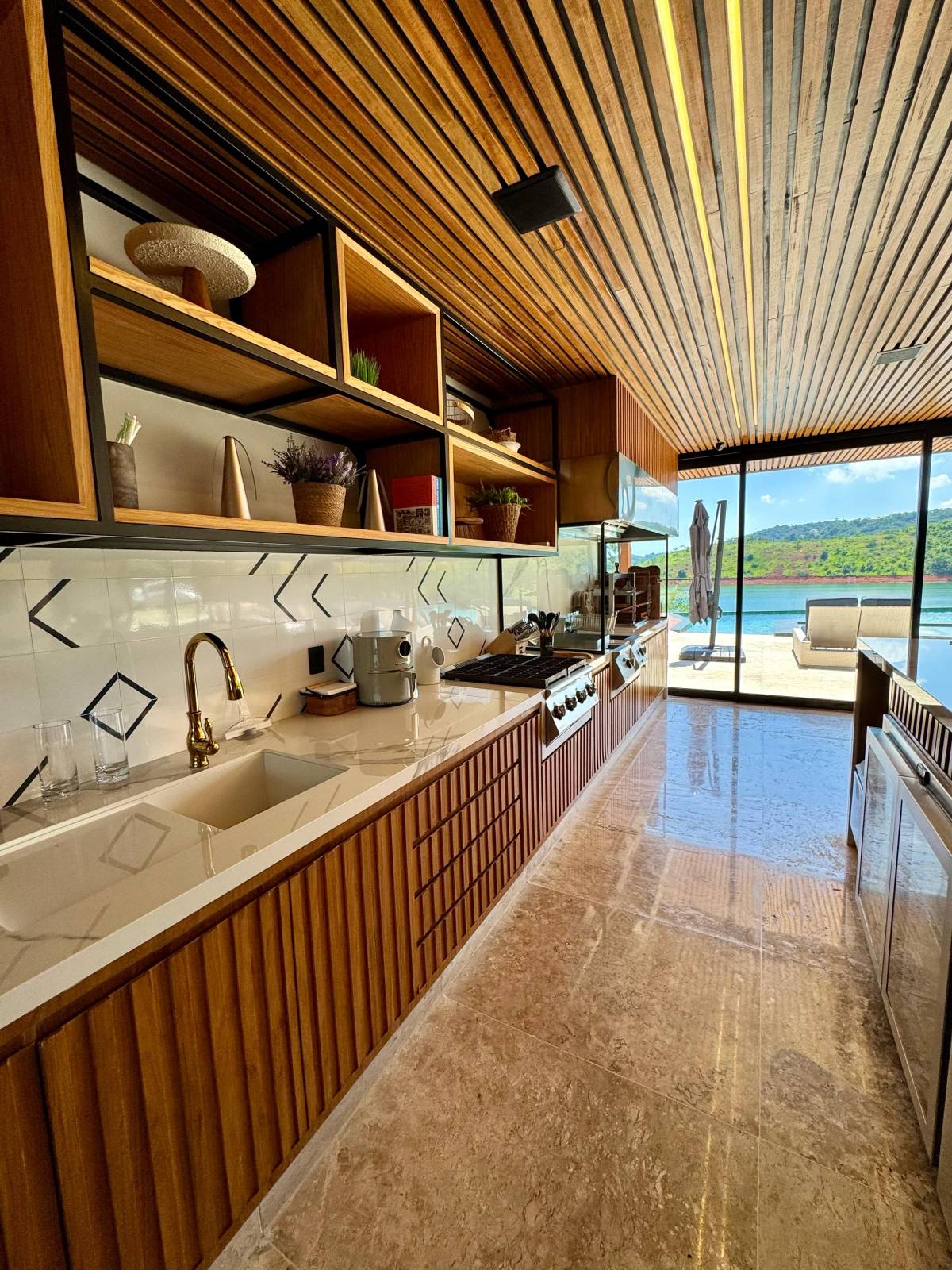 A casa dispõe de 5 amplas suítes, todas com vista privilegiada para a água, além de uma sala de cinema totalmente equipada. Os ambientes são integrados, destacando a cozinha completa conectada ao espaço gourmet, uma sala de visitas e uma sala de jantar que harmonizam elegância e funcionalidade.