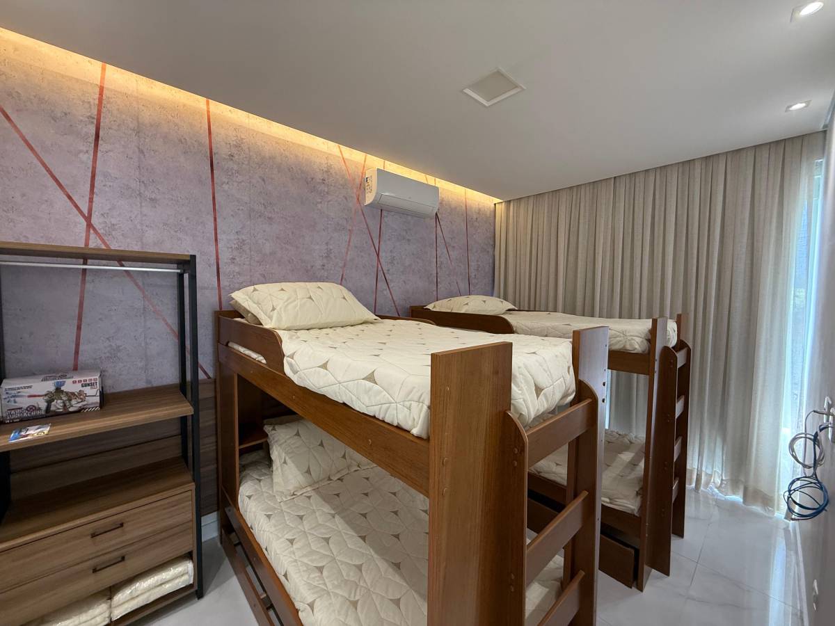 O pavimento superior abriga os dormitórios, sendo um deles decorado, outro com beliches, um escritório, e a suíte principal, que oferece um banheiro com banheira e uma vista espetacular para a represa.