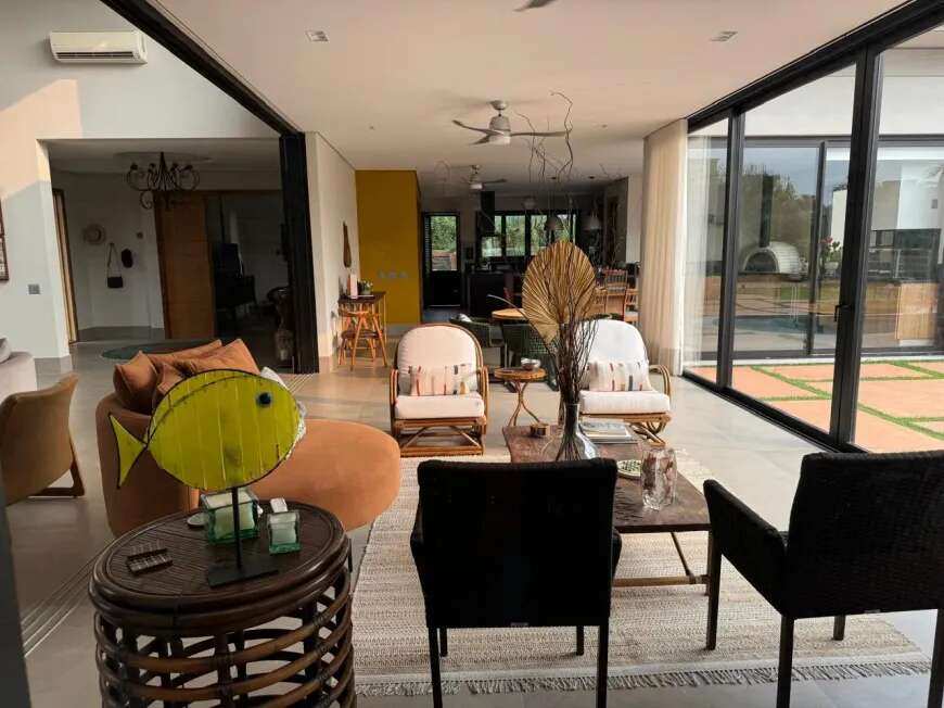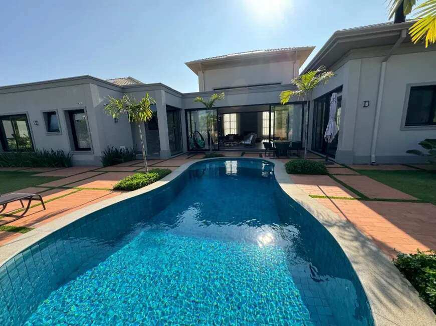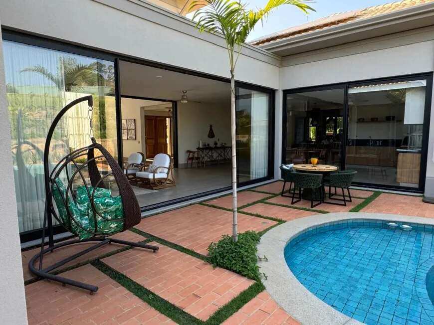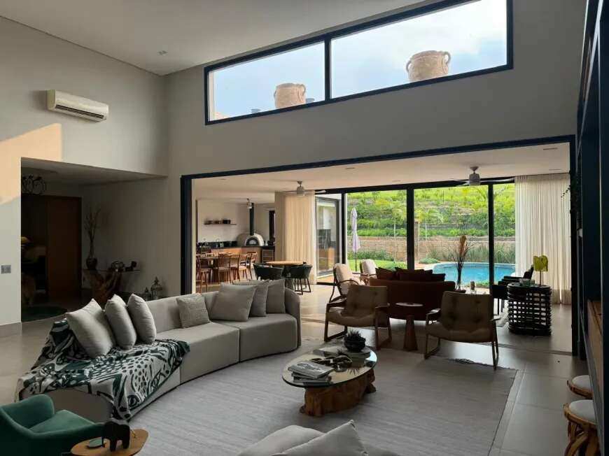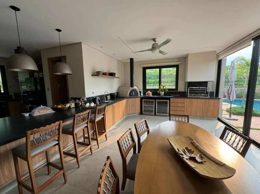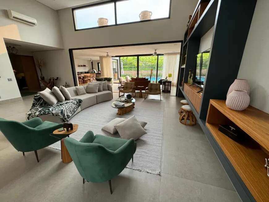 500m2 de área construída, 1.500m2 de terreno, térrea, com todos os espaços integrados, 5 suítes, sala de tv, academia, sauna, redário, piscina em formato orgânico, churrasqueira, forno de pizza, cozinha super equipada, espaço externo com gramado, praça com moveis e fogo de chão ecogarden, espreguiçadeiras, mesa e cadeiras corda náutica, horta orgânica, jardim de inverno em pedra, paisagismo, garagem para 6 carros com carregador para carro elétrico, acabamento em alto padrão, painéis fotovoltaicos, placas solares para aquecimento, lavanderia completa, repleta de armários, totalmente mobiliada e climatizada, enfrente a mata nativa de preservação permanente e ao lago do condominio, ou seja, sem vizinhos na frente, rua arborizada e quadra sem passagem para outras áreas do condomínio, com muita privacidade.