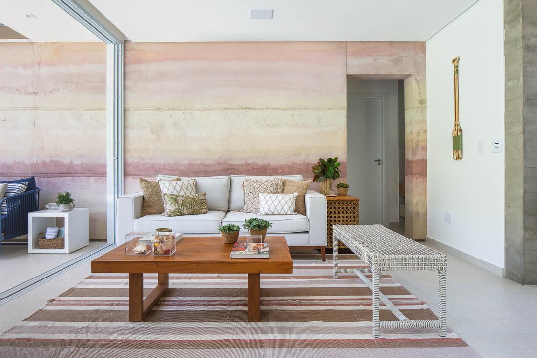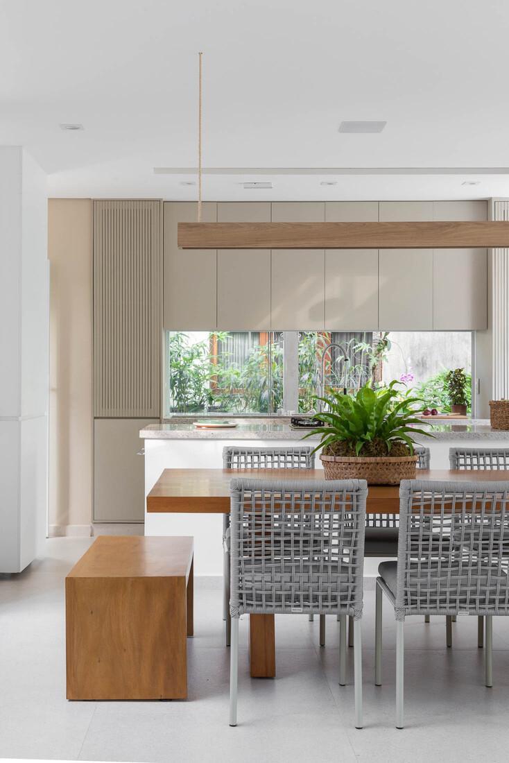 A sala de estar, jantar e a cozinha são integradas em um único ambiente espaçoso e convidativo, perfeito para reunir família e amigos. A cozinha está completamente equipada com utensílios modernos, incluindo máquina de lavar louça, forno de microondas, forno elétrico e cervejeira, ideal para quem aprecia o prazer de cozinhar.