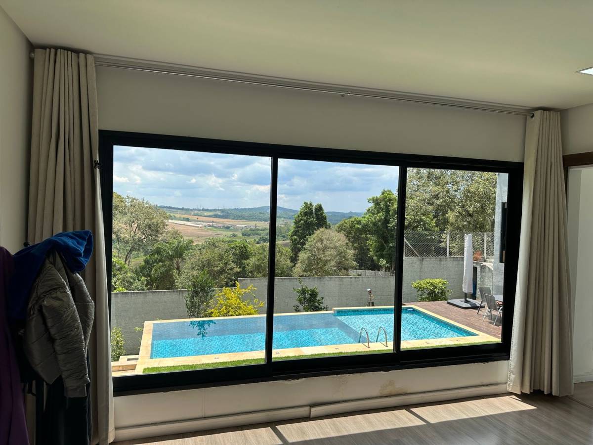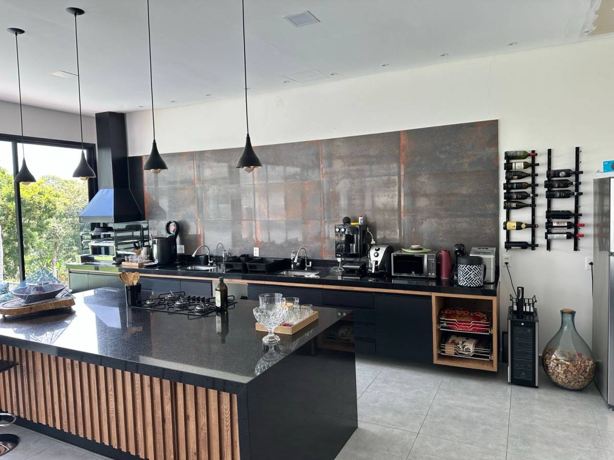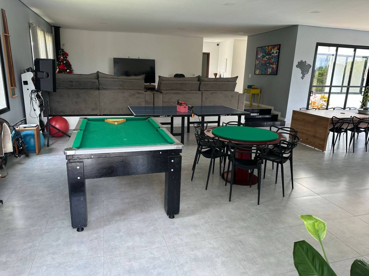 Casa térrea com ampla área de lazer 4 suítes com ar condicionado quente/frio, Loft totalmente integrado com mais de 100 metros quadrados com cozinha, ilha, sala de tv e lareira, sala de jogos e sala de jantar no mesmo ambiente, área de serviço,piscina com borda infinita, com por do sol incrível, sauna, pomar formado, quintal, chácara cercada, garagem para 6 carros ou mais,