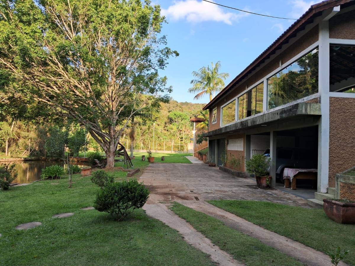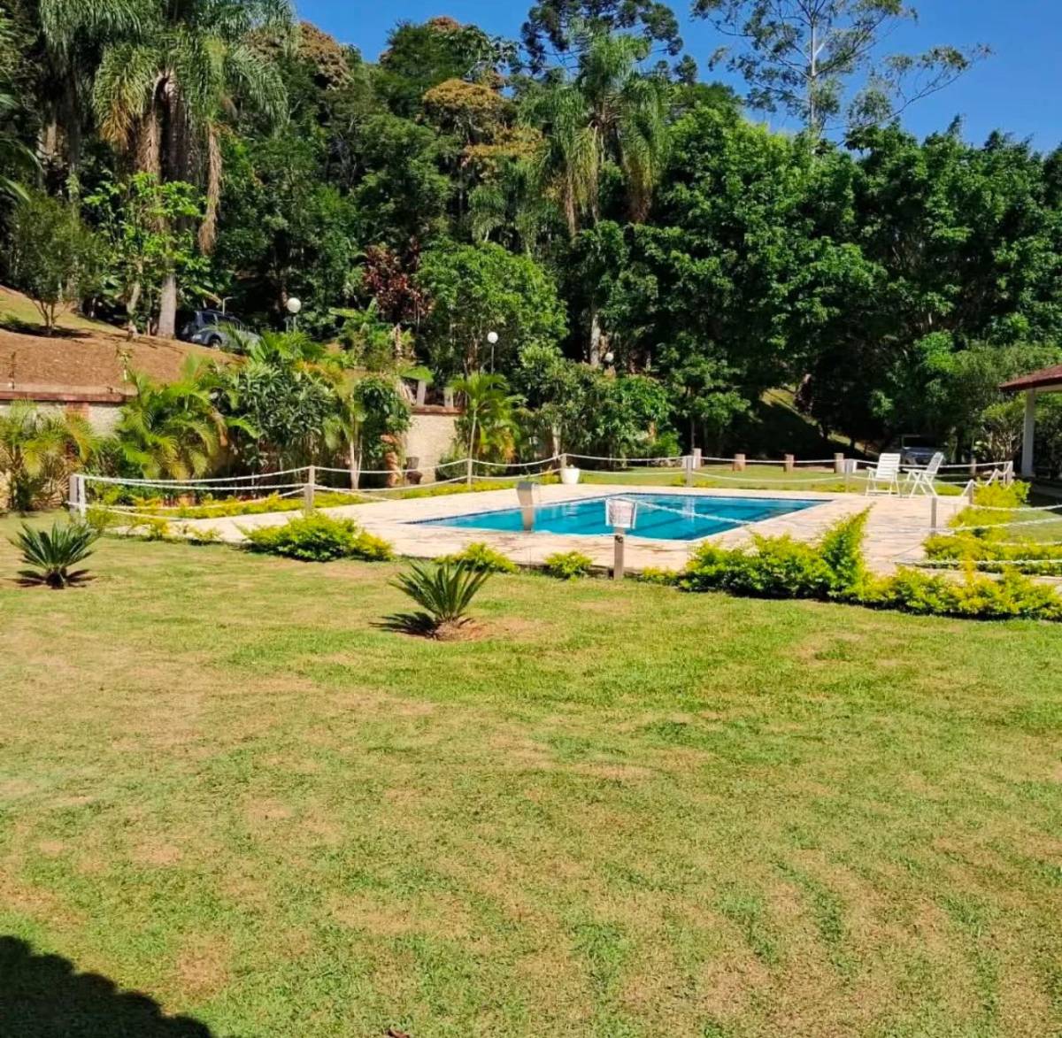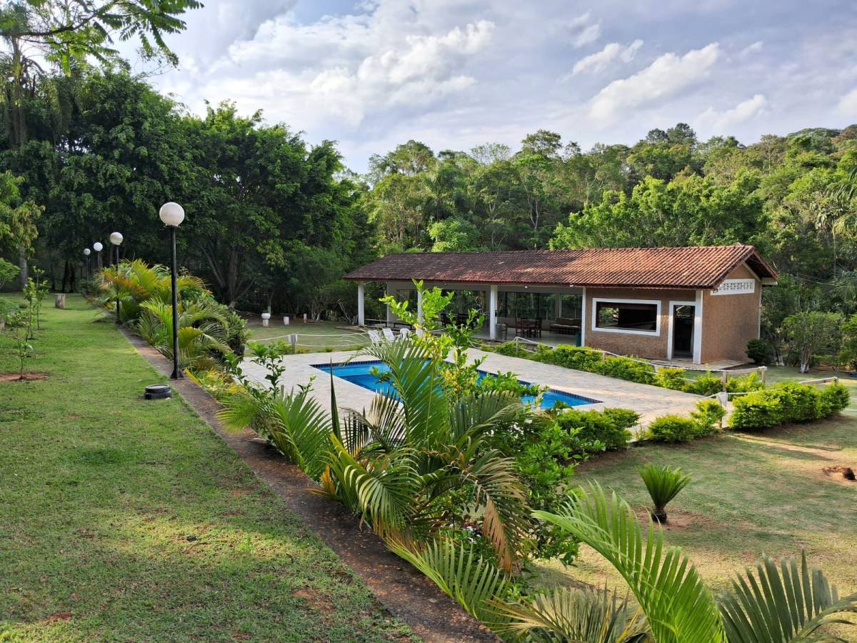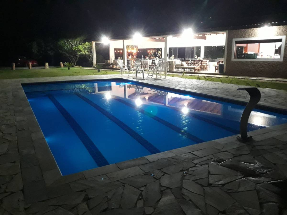 Com 15 mil metros quadrados. Possui dois lagos com peixes, piscina novinha (10X5), energia solar, Internet, salão de festas, duas belas cozinhas, três suítes, 4 garagens cobertas, estacionamento para 30 carros, 5 banheiros...