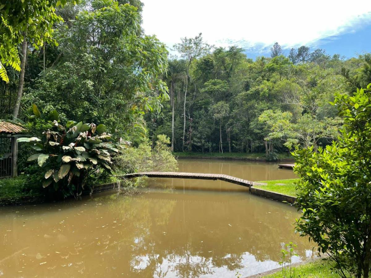 com casa de 2 andares, lago com ponte e área verde. Localizado em área tranquila próximo à natureza. Perfeito para quem busca paz e sossego.